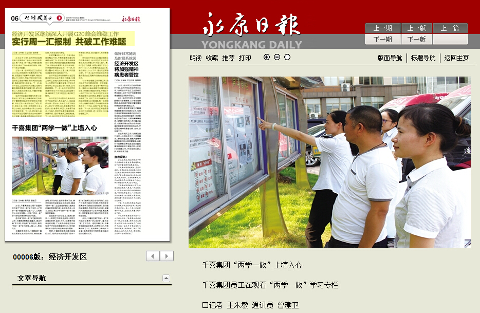 | <永康日?qǐng)?bào)>:千喜集團(tuán)“兩學(xué)一做”上墻入心 閱讀12272次 發(fā)布日期:2016/7/26 |