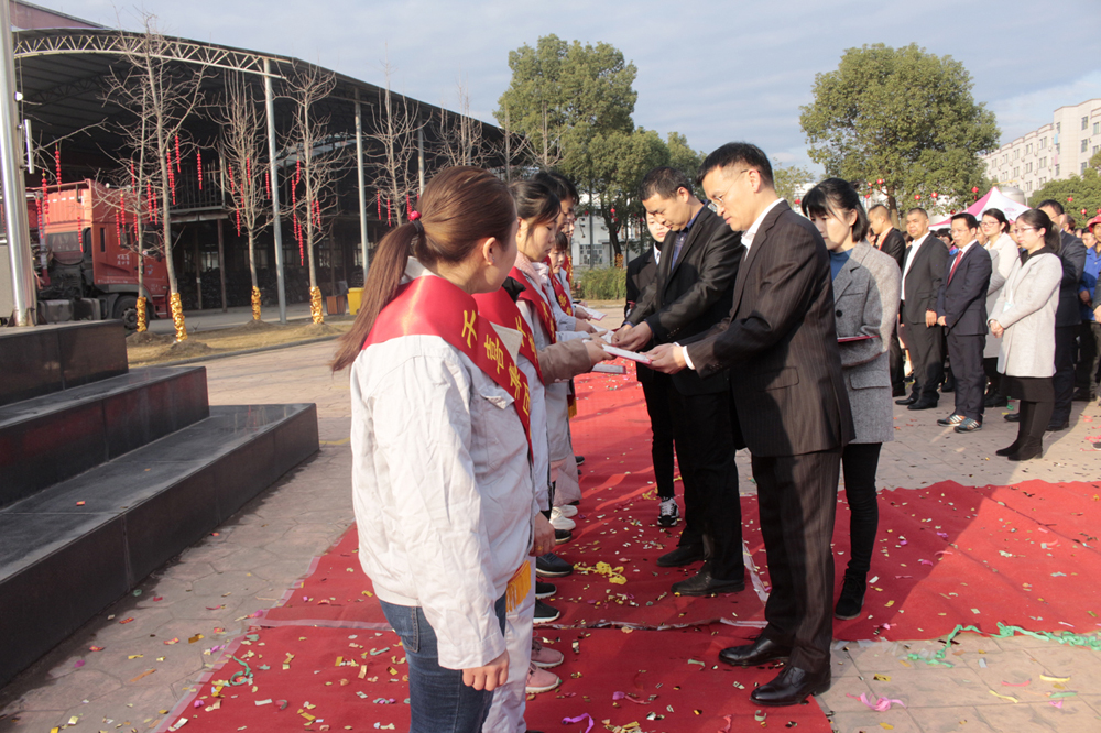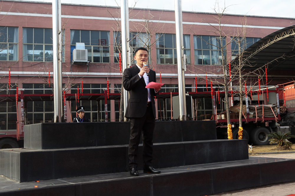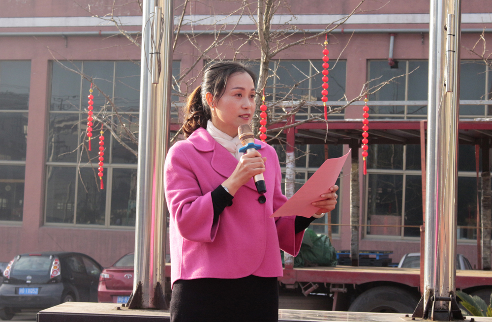 首先,進行的是升國旗儀式。當(dāng)雄壯激昂的國歌奏響時,五星紅旗徐徐升起、迎風(fēng)飄揚,全體人員莊嚴(yán)地向國旗行注目禮。禮畢后,千禧龍纖事業(yè)部總經(jīng)理陳宏則作為各事業(yè)部總經(jīng)理的代表,上臺發(fā)表致辭。致辭中,陳宏總結(jié)了2019年度千喜集團各事業(yè)部取得的成就與收獲,肯定了全體人員的辛勤付出和努力,并對大家的付出表示衷心感謝。同時,對于2020年度的多個“小目標(biāo)”,他也許下了自己的期許,希望在全體人員的努力下,各事業(yè)部都能在各自的行業(yè)中熠熠發(fā)光,不斷朝著既定的目標(biāo),努力前進,實現(xiàn)千喜集團的價值,實現(xiàn)千喜人的價值。